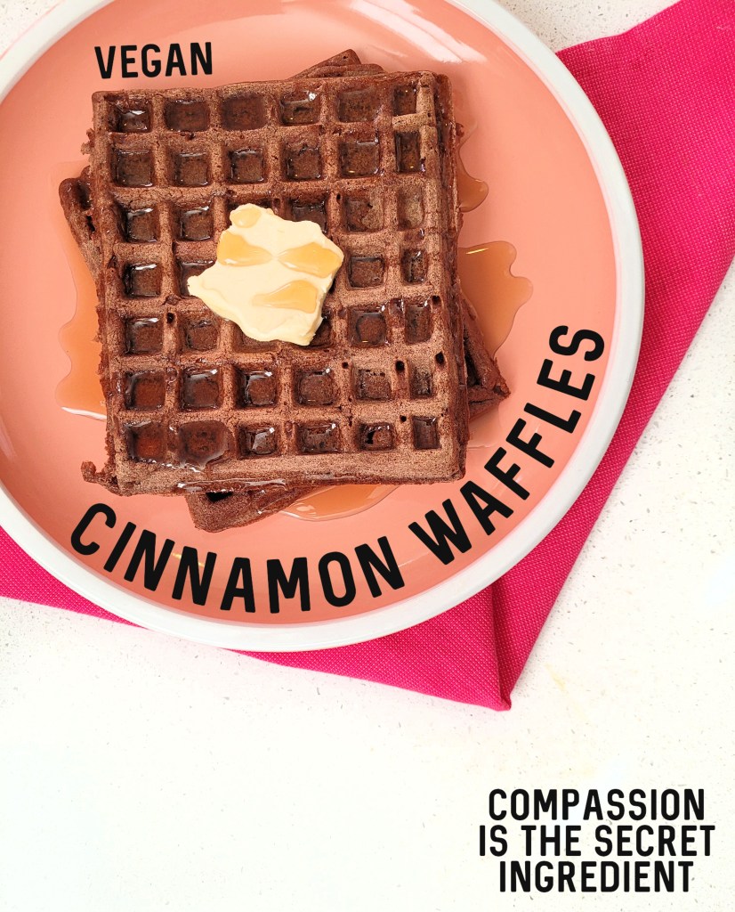 But for today we have just a good ol’ fashioned recipe post… Vegan Cinnamon Waffles! These waffles are quick and easy, and wonderfully chewy. This recipe works great in my George Foreman grill with the waffle plates in place. My Georgie makes 2 – 8″ x 6″ waffles at a time and at that size this recipe yields 4 waffles – that’s 2-4 servings depending on who’s eatin’. Now, obviously if your waffle maker is smaller or bigger this recipe is going to give you more or less waffles but, if you are needing more, you could very easily double the recipe off the bat and feed the masses! Enjoy 🙂